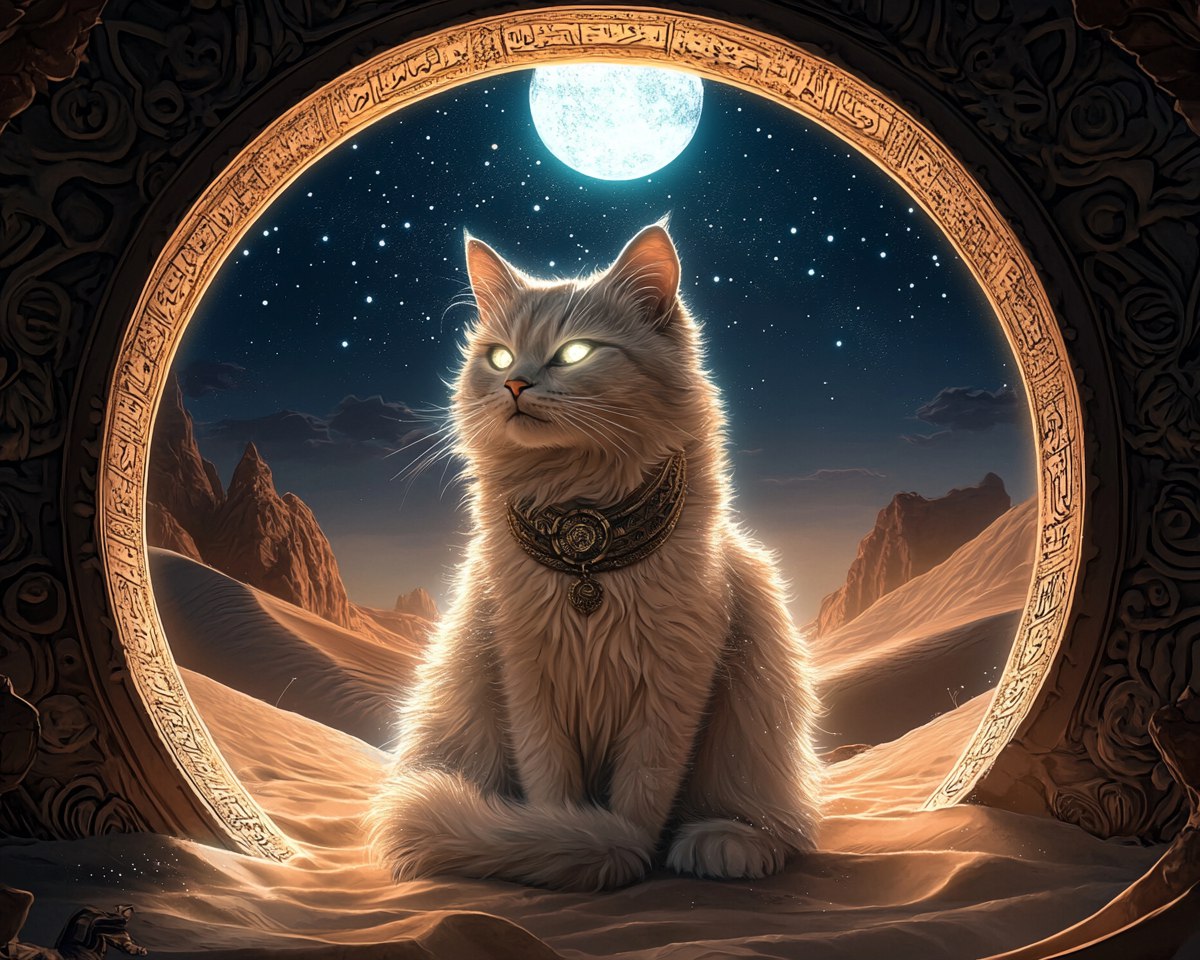 Мур аль-Фарид — мистический кот, чья шерсть мерцает, как звёздный песок, а глаза сияют мудростью веков. Появился в оазисе под лунным небом, где, по ле...